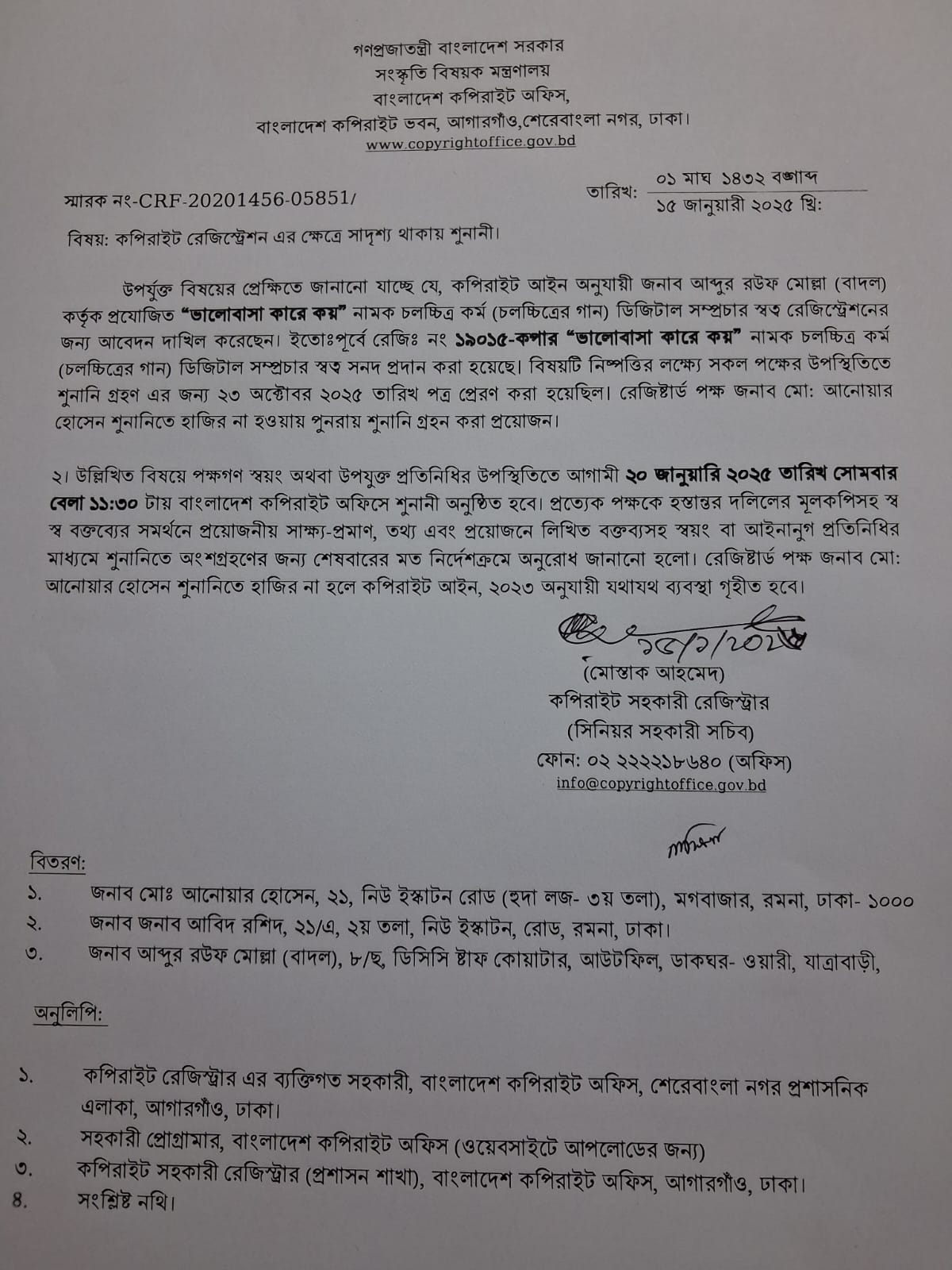 | ৭ | ভালোবাসা কারে কয় নামক চলচ্চিত্র কর্মের কপিরাইট রেজিস্ট্রেশন সংক্রান্ত শুনানী। | | | ১৮-০১-২০২৬ | দেখুন |